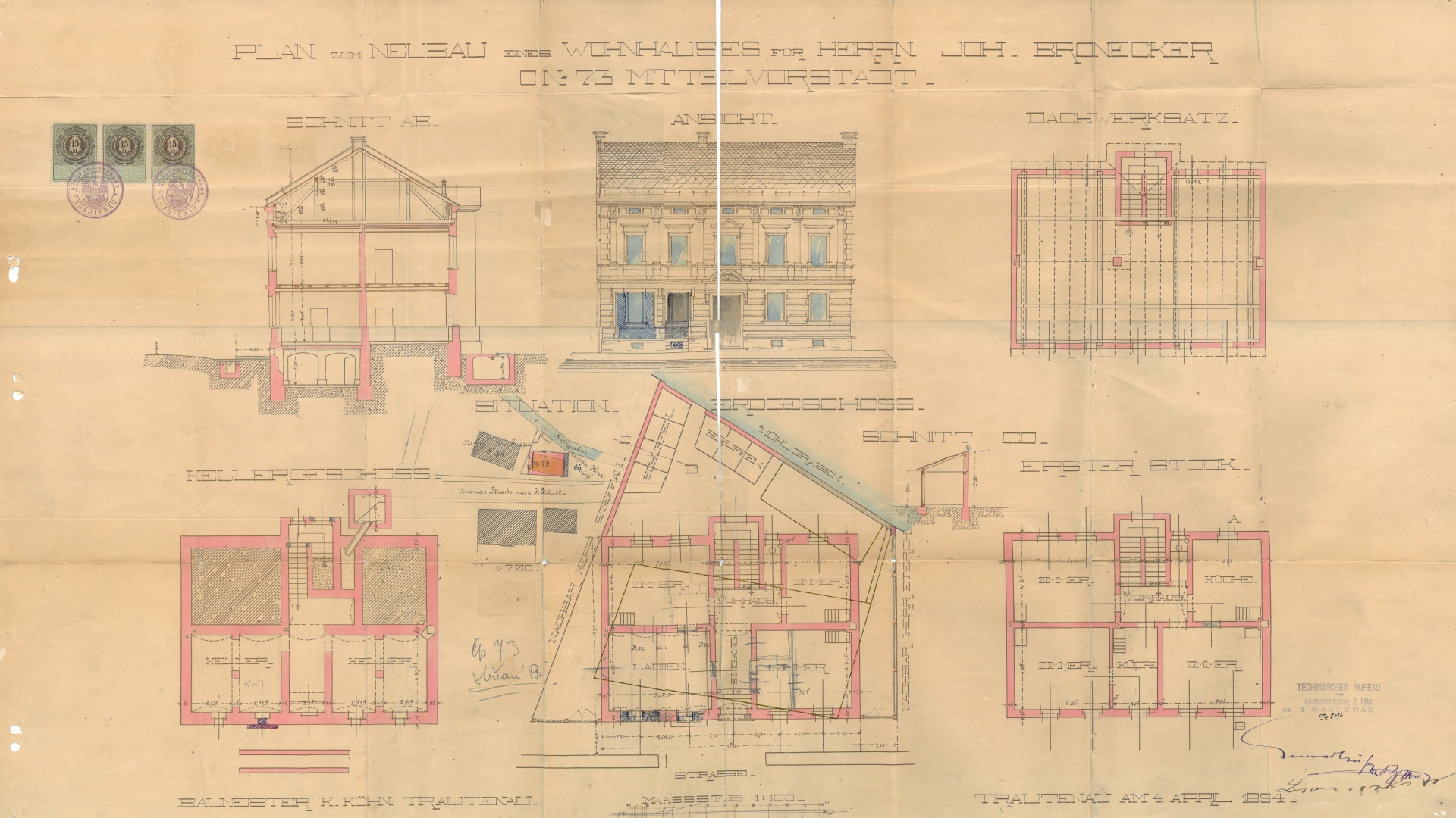 | Název: | Půdorysy, řez a pohled z r. 1894 |